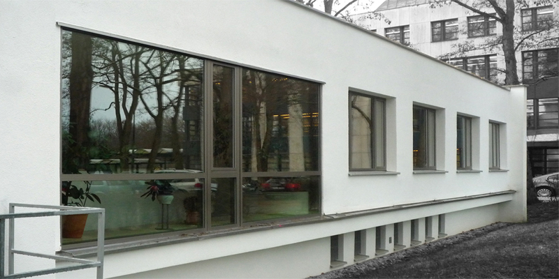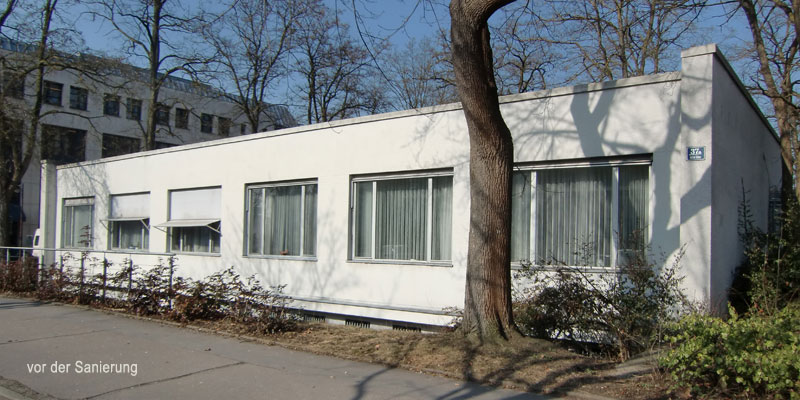 Die energetische Ertüchtigung erfolgt durch die Dämmung der Außenwände von Keller- und Erdgeschoß, Austausch der Fenster und Eingangstüren sowie Einblasdämmung des Daches unter Beibehaltung des Dachstuhls. Die Rollokästen inkl. Behang auf der Südseite werden mit den Bestandfenstern ausgebaut, als Ersatz werden Raffstoren mit Flachlamellen mit den neuen Fenstern in der Ebene des WDVS eingebaut. Die eloxierten Aluminiumfenster sind abgestimmt auf das Farbspektrum der 1950er Jahre.